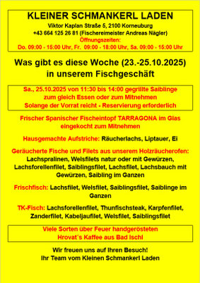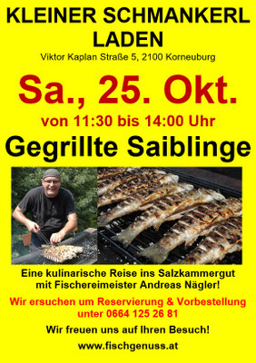 Das bedeutete 100% Umsatz- und Verdienstentgang. Aus diesem Grund habe ich mein Geschäftsmodell anpassen müssen. Ich eröffnete für Sie am 05. November 2020 meinen "Kleinen Schmankerl Laden"! Mittlerweile bin ich wieder mit meinen gegrillten Saiblingen auf Tour und ich nehme auch wieder an Events teil, der Kleine Schmankerl Laden bleibt jedoch weiterhin geöffnet!
